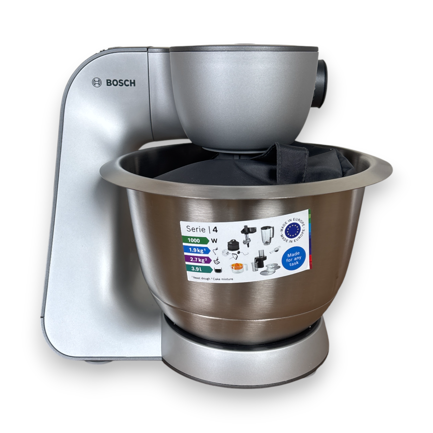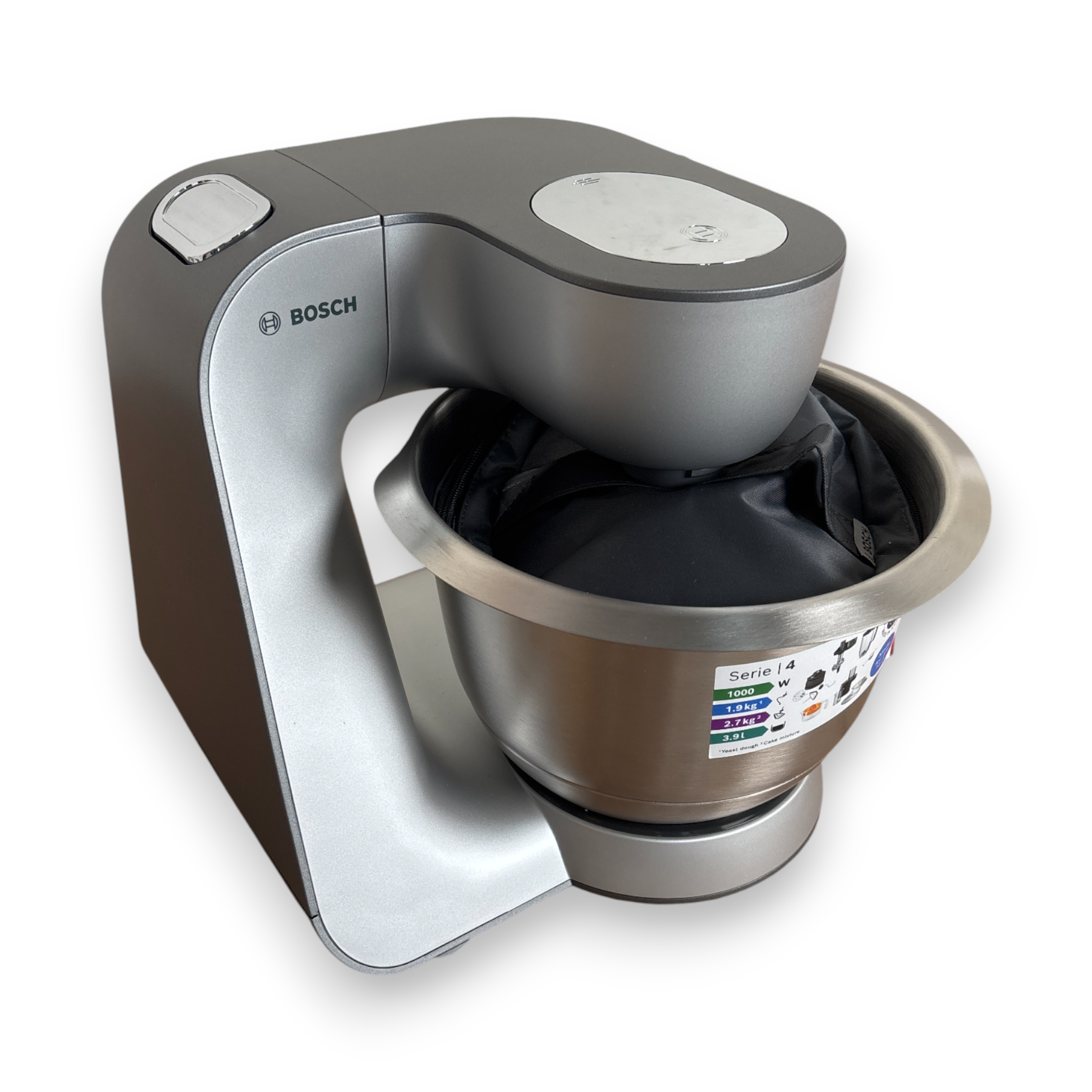 - Große 3,9l Edelstahlschüssel: mit spezieller Innenform für eine optimale Zubereitung der Teige. (bis zu 2,7 kg Rührteig / 1,9 kg Hefeteig)