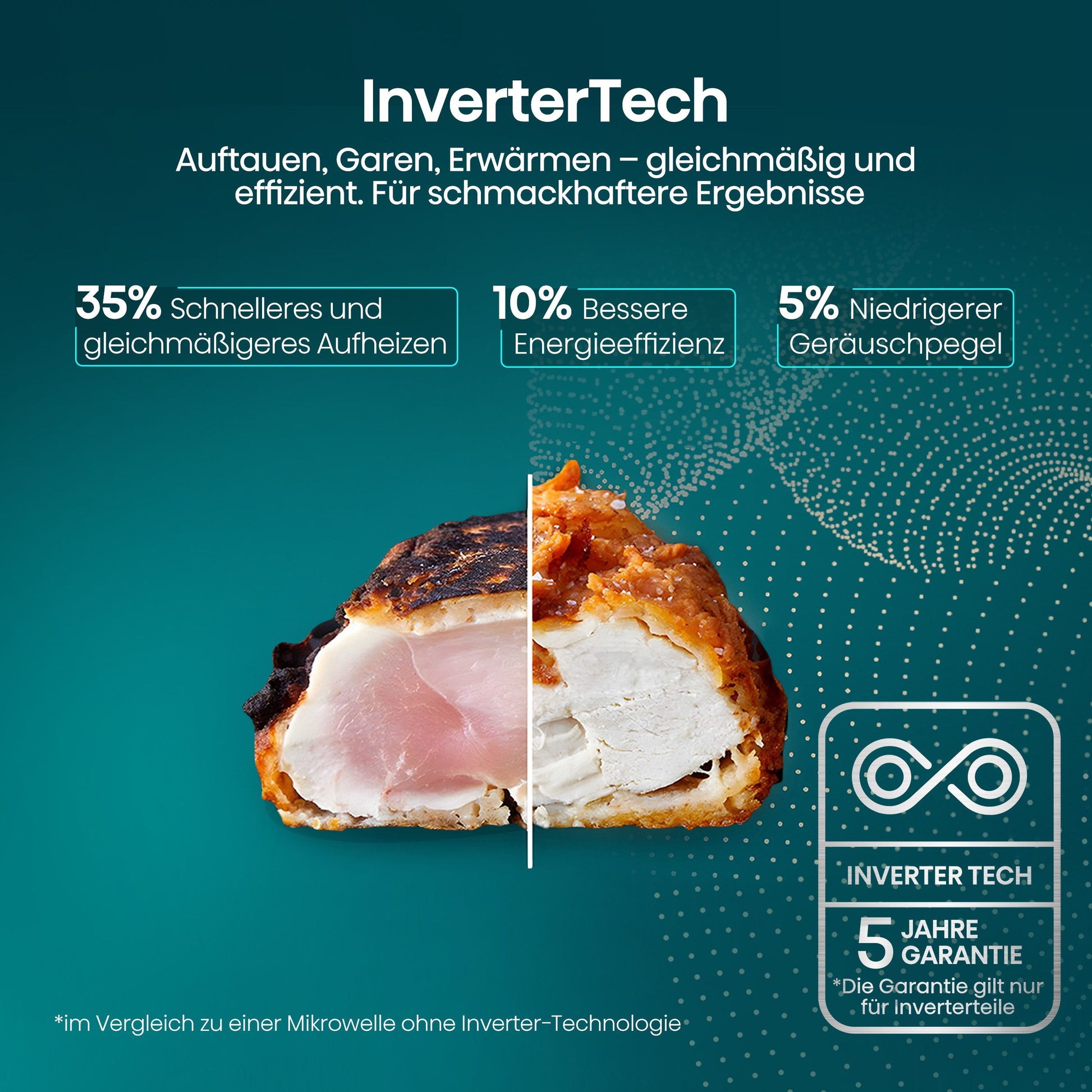 - Die innovative Inverter Technologie bietet gleichmäßige Erwärmung, präzisere Leistungssteuerung, schnellere Zubereitung, bessere Energieeffizienz und konstant gute Ergebnisse.