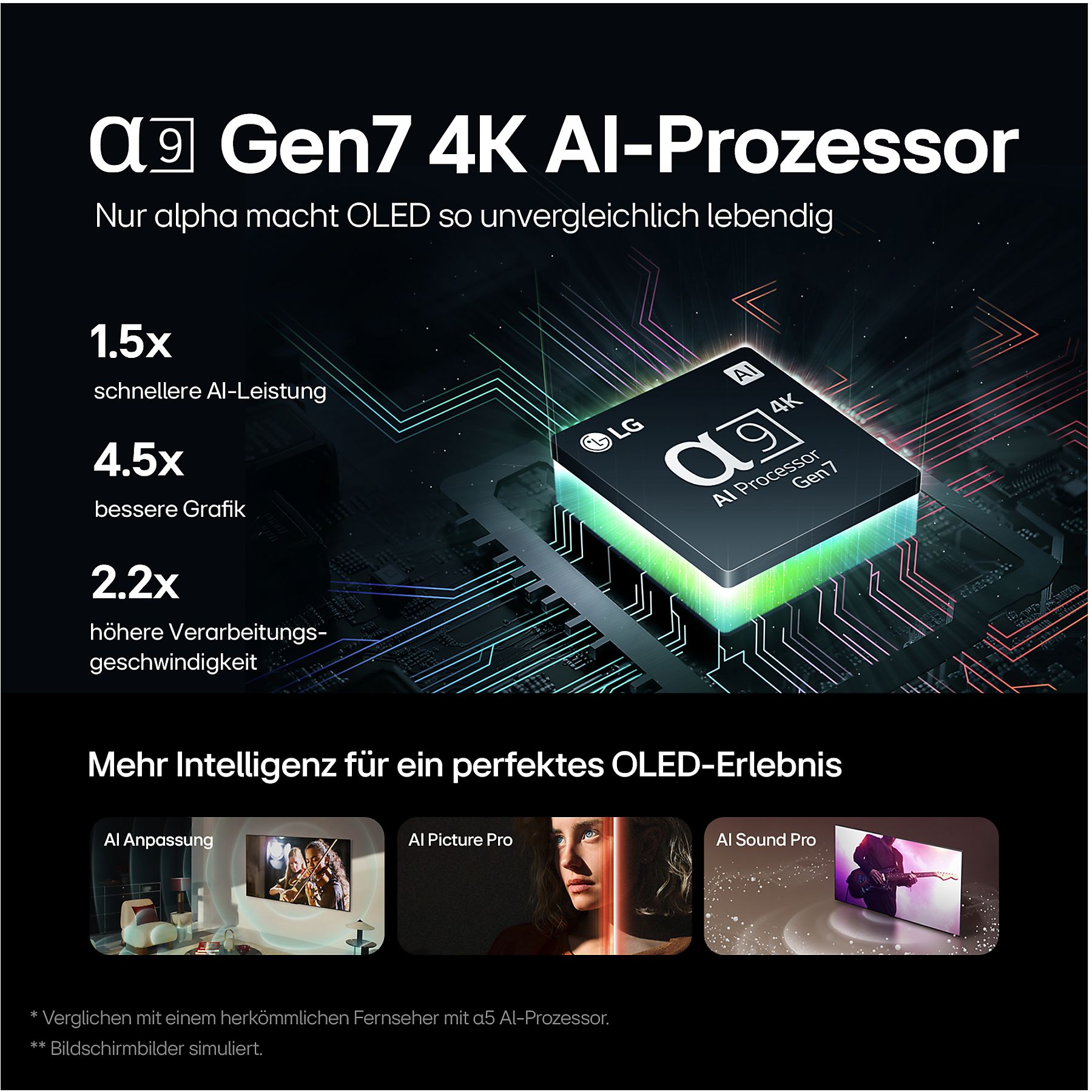 Dank des fortschrittlichen α9 4K AI-Prozessors der 7. Generation wird die Leistung des LG OLED TVs deutlich verbessert, um Bild, Ton und Helligkeit in Echtzeit zu optimieren. Die visuelle Erfahrung wird auf ein neues Niveau gehoben, indem die Bildqualität gesteigert wird, während 4K AI Super Upscaling, AI Object Enhancing und OLED Dynamic Tone Mapping Pro dazu beitragen, niedrig aufgelöste Inhalte in beeindruckender 4K-Auflösung zu präsentieren. Zudem wird die Audioquelle mit AI Sound Pro analysiert und mit Unterstützung von AI Clear Sound in ein immersives 9.1.2 Up-mix Surround-Sound-Erlebnis umgewandelt. Genieße eine verbesserte Leistung und erstklassige Bildqualität!