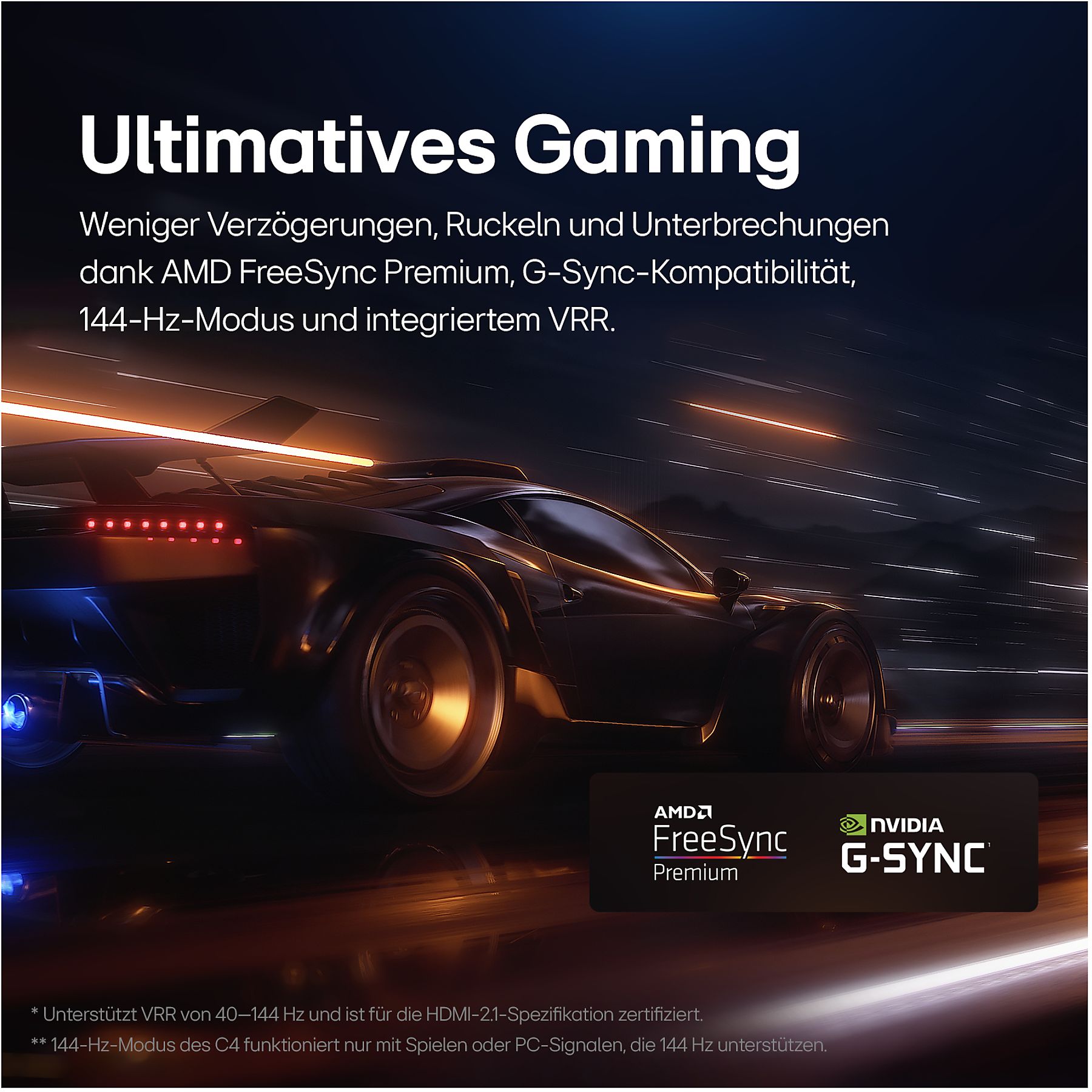 Für beeindruckend flüssige Bildwiedergabe ohne Tearing bis zu 144 Hz werden die OLED TVs durch NVIDIA G-Sync und AMD FreeSync Premium unterstützt. Dank VRR, HGiG, ALLM und QMS ist eine atemberaubende Grafik auch bei schnellsten Spielgeschwindigkeiten garantiert. Zudem macht der Game Optimizer einen zentralen Zugriff auf alle gamingbezogenen Bild- und Soundeinstellungen möglich und mit der nahtlosen Integration von NVIDIA GeForce NOW kannst du direkt von deinem OLED TV auf eine scheinbar grenzenlose Welt der Spiele zugreifen. Bist du bereit für superschnelle Action, die nie ins Stocken gerät?