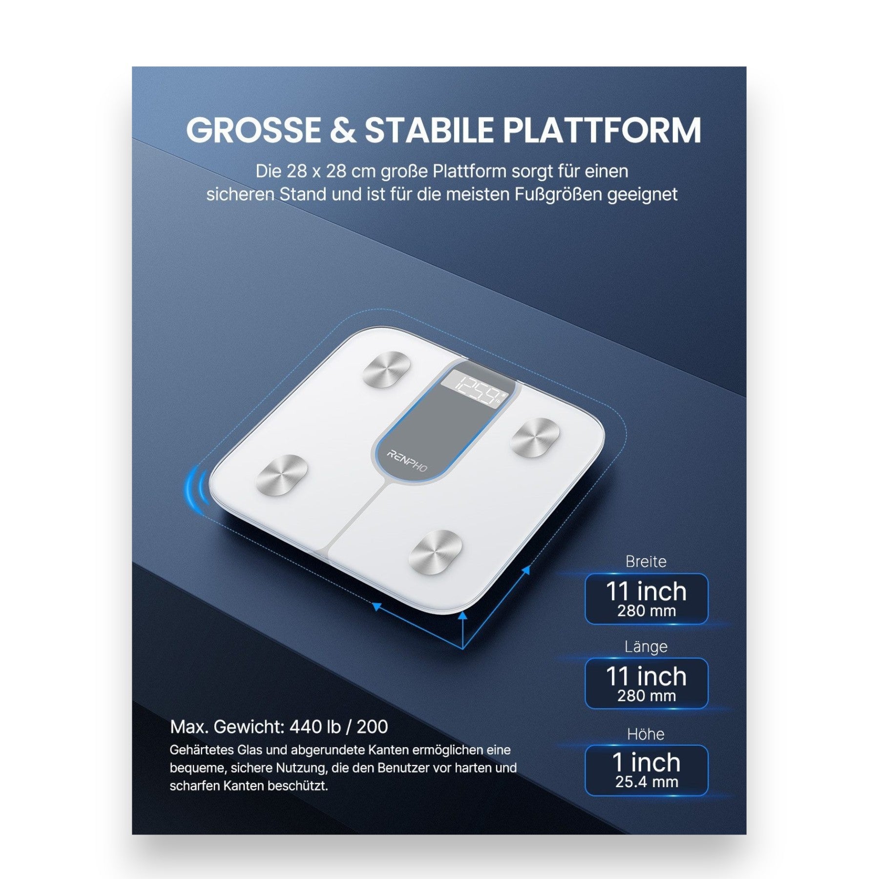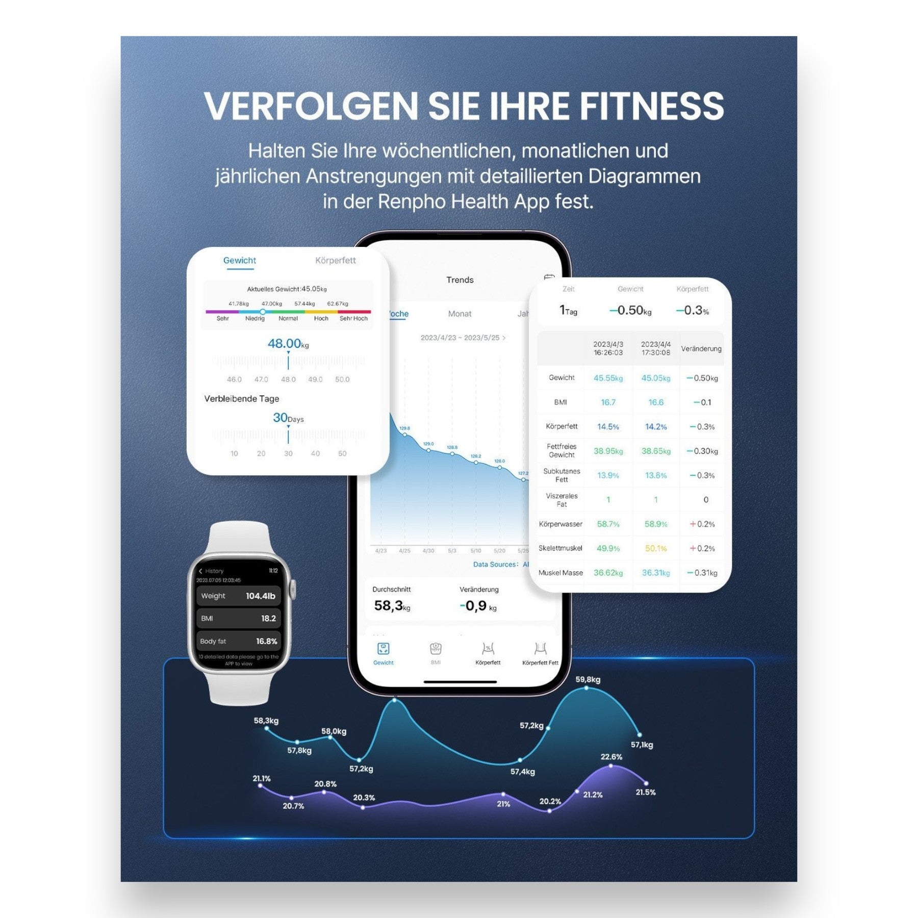 - Synchronisation mit RENPHO Health App, Apple Health, Google Fit, etc.