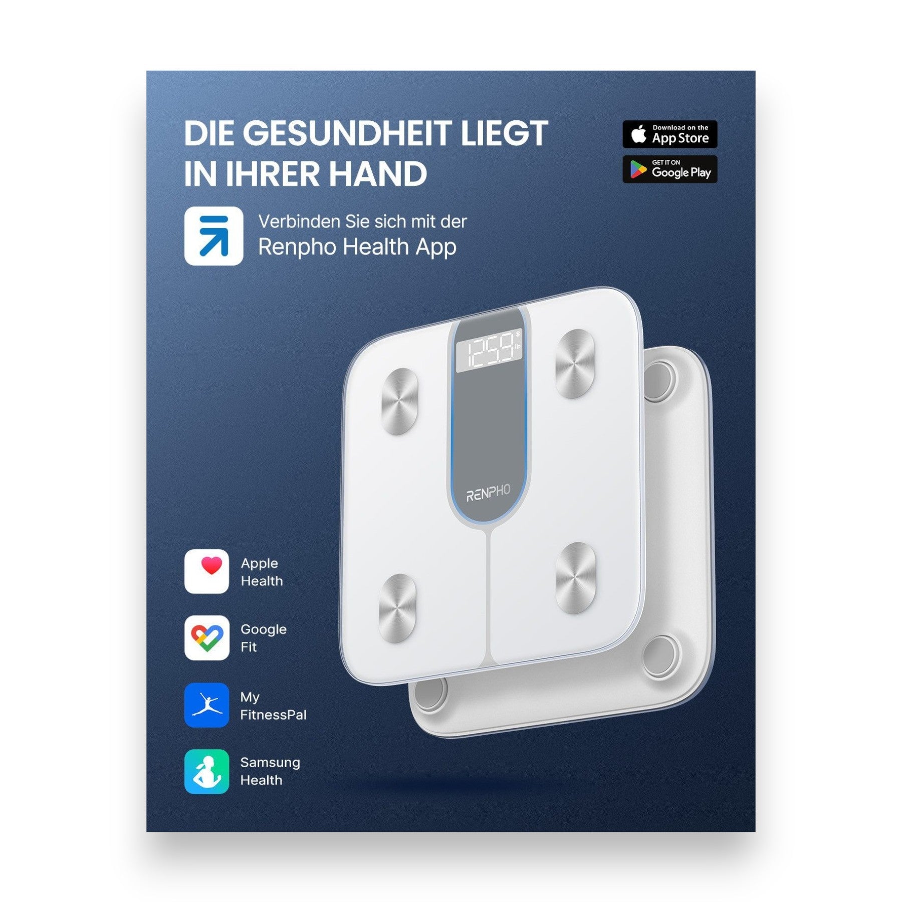 | Kompatible Apps | Apple Health Fitbit Google Fit MyFitnessPal Renpho Health App Samsung Health |