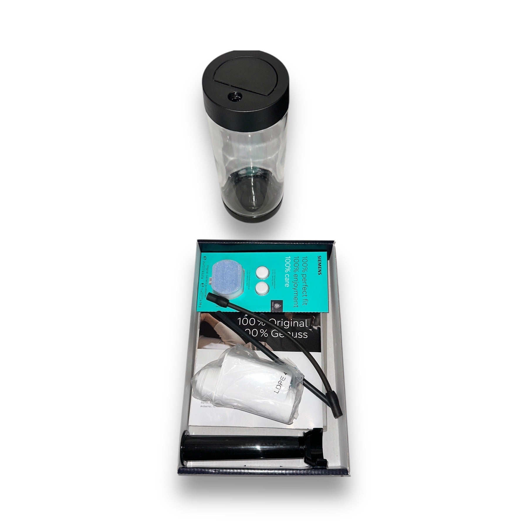 | Mitgeliefertes Zubehör | Brita Filter Einsetzhilfe Milchbehälter Milchsteigrohr Set Reinigungs- und Entkalkungstab. SE Teststreifen f. Wasserhärtegrad-Bestimmg Verbindungsschlauch zu Milchdüse Wasserfilterpatrone BRITA INTENZA |